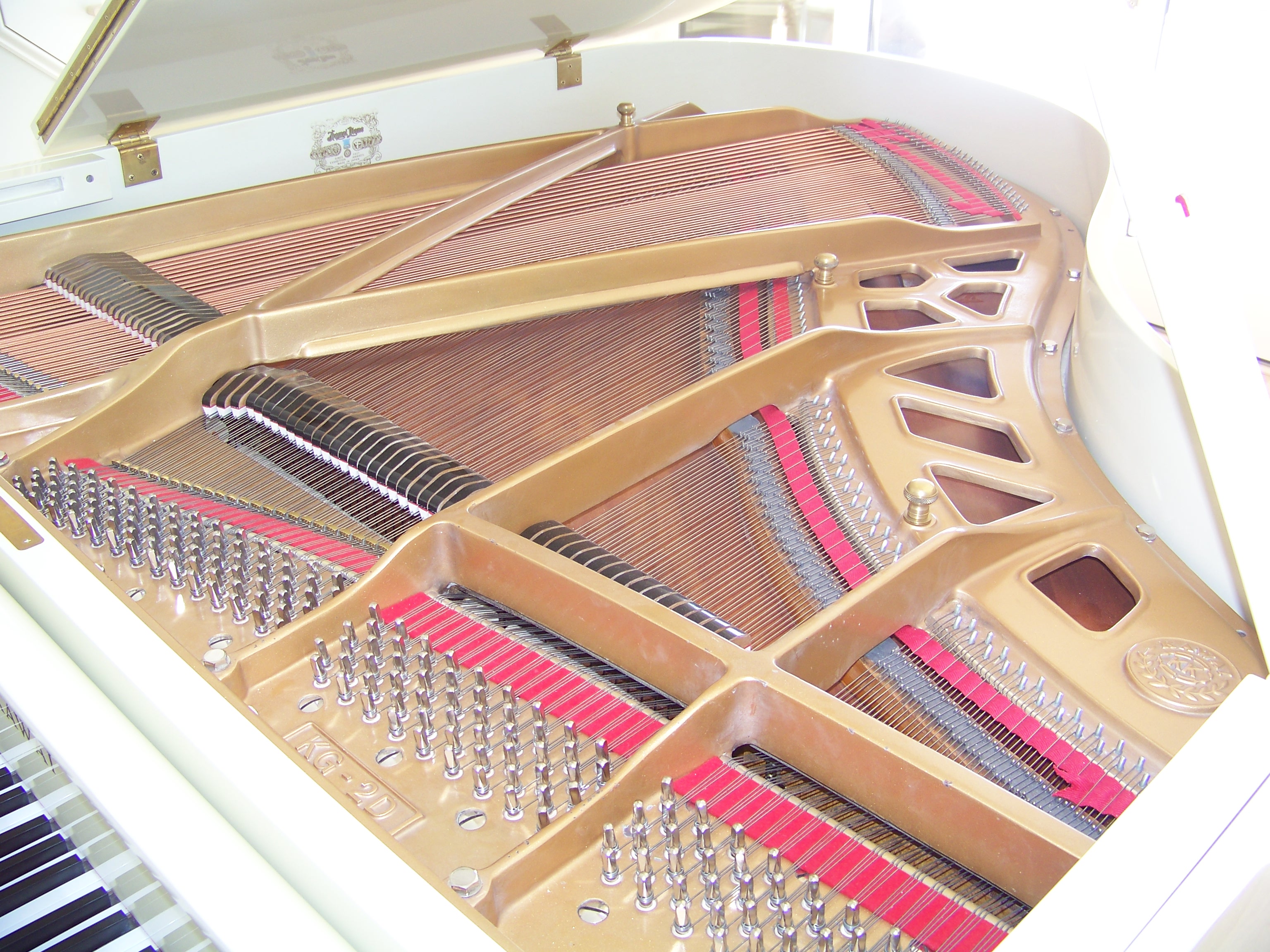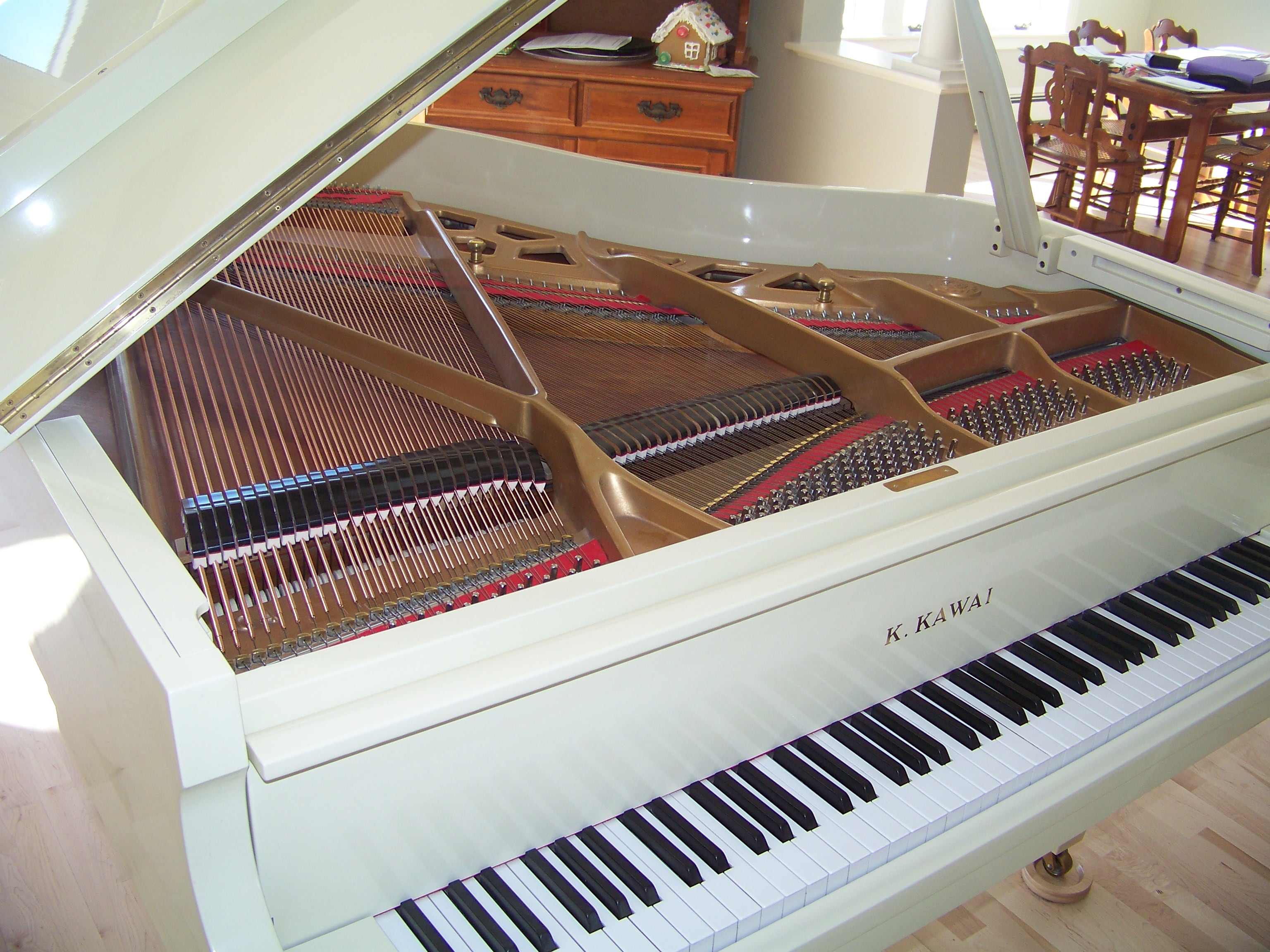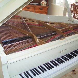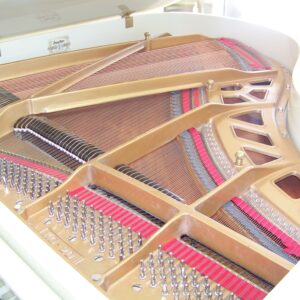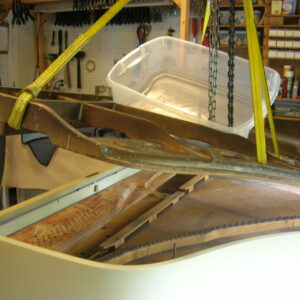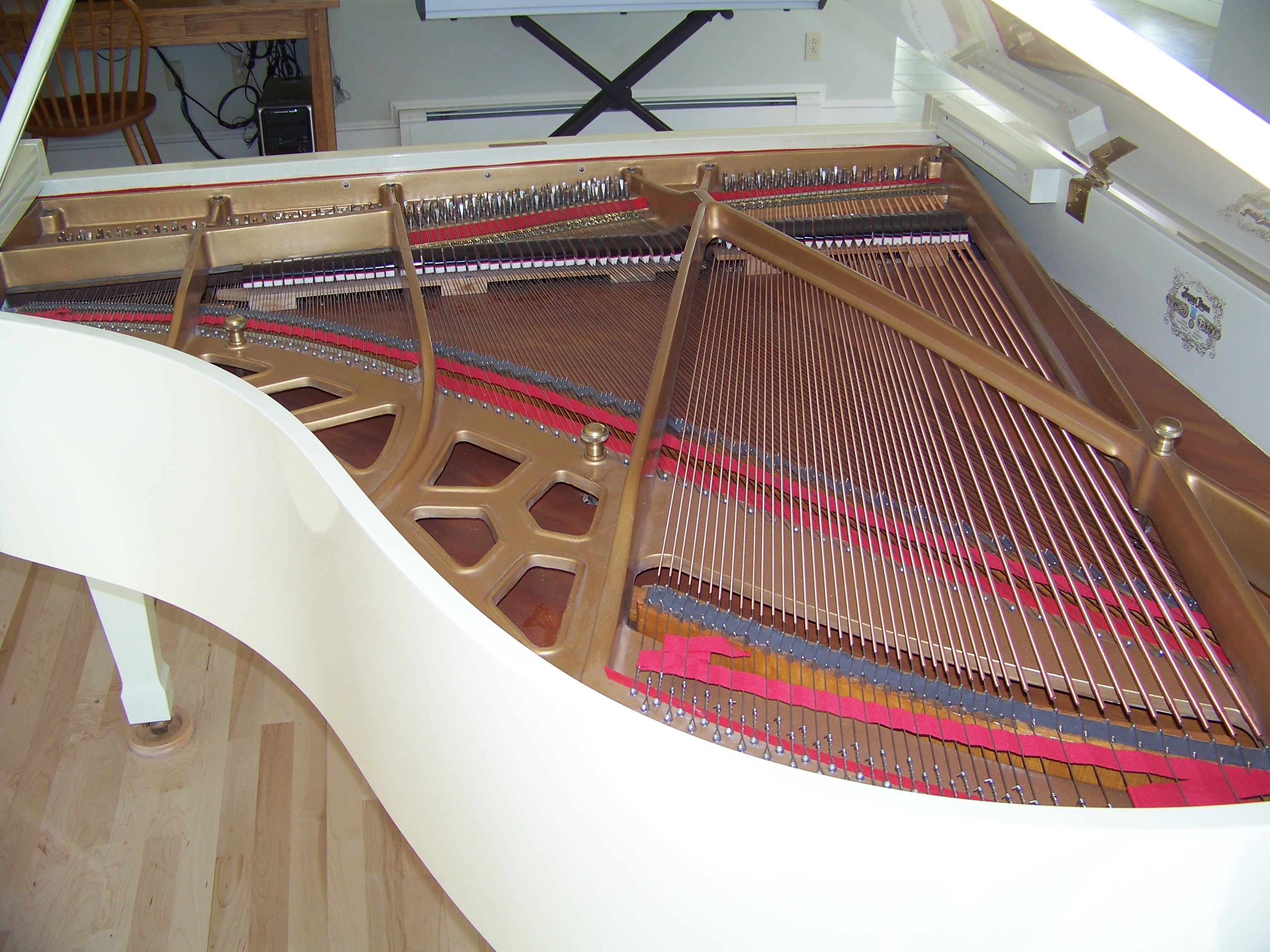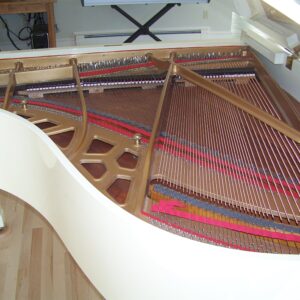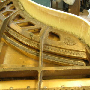 This piano suffered smoke and water damage in a house fire. Original finish was high gloss ivory. While I am not a “refinisher”, I’m not apt to shy away from a challenge. Following the advice of a colleague from Pennsylvania, I used various compounds to clean and polish the finish to its original sheen. The risk of rubbing through the finish was real so I had to proceed judiciously. I also was tasked with restringing the instrument. Rather than refinishing the plate, I was able to clean and hand rub its finish as well. I seemed to have neglected to take photos of the process this time but the following pictures show the stark difference of before and after.